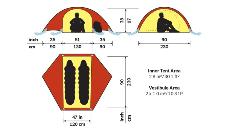 Twee kruispunten van gelijke lengte creëren de basisvorm, en een kortere paal in het dak biedt vestibule hoofdruimte en draagt ​​bij aan de algehele stabiliteit. Palenmouwen met enkele opening zorgen voor een snelle pitching, en bovenleidingen in de bodem van de buitenste tentwanden zorgen voor constante ventilatie. De deuren van de binnentent zijn allemaal van gaas voor een volledige luchtstroom en beide vestibules kunnen worden opgerold voor extra ventilatie.